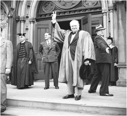 And that is not the end são as últimas palavras de quem visiona uma coligação que preserve Peace and Freedom nos anos negros da luta contra o expansionismo nazi. Os Allies saem da II World War com o objetivo de erguer uma ordem mundial assente em nobre combate — contra os five giant evils: a miséria, a ignorância, a necessidade, a desocupação e a doença. Nos ventos frescos de sucessivas travessias atlânticas alinhava Mr Churchill as suas teses para o pós-guerra Em 1942 dirige-se aos jovens de Harvard University, que o distingue com a Honorary degree. A mensagem é memorável: “Law, language, literature – these are considerable factors, common conceptions of what is right and decent, a marked regard for fair play, especially to the weak and poor, a stern sentiment of impartial justice, and above all the love of personal freedom.”