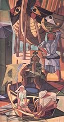DOMINGO LISBOETA de José de Almada Negreiros Prosseguimos as sugestões de férias! Na Gare Marítima da Rocha de Conde de Óbidos, Almada Negreiros realizou seis pinturas murais, organizadas como se fossem dois grandes trípticos, um representando cenas da vida lisboeta ao domingo, junto ao Rio Tejo, e outro, o tema da emigração, condensada numa cena de despedida no cais. Nestes trípticos, conjuga-se o desenho geometrizado, de raiz cubista, com um tema populista local. Por este último aspeto, poderia considerar-se Almada um pós-moderno «avant la lettre», ele que foi um dos principais introdutores do modernismo em Portugal, desde os anos dez do século vinte! Quando foram apresentadas ao público, estas pinturas causaram polémica, tanto de ordem estética como política. Nesse momento, os jovens interessavam-se pelo neorrealismo e pelo abstracionismo geométrico. Almada estava mais interessado nas sínteses das conquistas da vanguarda e não tanto nos seus radicalismos. Estes murais, e os numerosos guaches que foi realizando durante esses anos, atualizaram um certo cubismo picassiano, de arabesco audacioso. Na estilização das figuras, na demarcação das zonas de luz e de sombra, no recorte dos perfis, todas as possibilidades expressivas das linhas são exploradas, quer sejam estruturantes quer sejam envolventes. Há por vezes malícia no modo como acentuam algum pormenor; enfatizam a teatralidade dos gestos das figuras humanas, podendo reparar-se que, quanto mais pura é a forma, mais nítido é o gesto, como o braço que se estende para apanhar o boné que caiu à água; e, ricas de implicações espaciais, as linhas comandam a composição e acentuam o construtivismo que, desde o início da sua atividade de desenhador, sempre interessou a Almada e que o levará até um peculiar abstracionismo de cariz conceptual, em 1957.