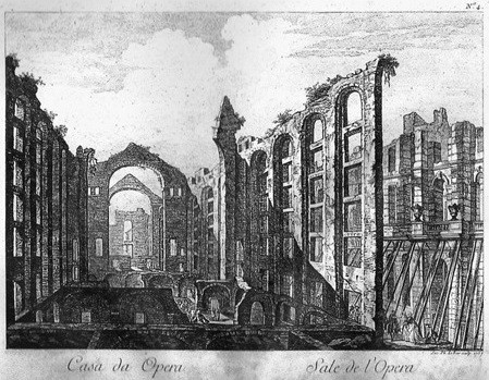 Acaba de ser publicado um livro da autoria de Aline Gllaschi-Hall de Beuvink, professora da Universidade Autónoma de Lisboa e especialista em História da Arquitetura e do Espetáculo: e precisamente, o estudo agora publicado, “Ressuscitar a Ópera do Tejo – o Desvendar do Mito” (ed. Caleidoscópio) evoca, com larga informação e muita qualidade, o Teatro- edifício, junto ao Terreiro do Paço que, durante 7 meses marcou a vida cultural e urbana de Lisboa, de 31 de Março a 1 de Novembro de 1755, até ser destruído pelo Terramoto. Ficaram entretanto memórias e documentos que o livro cita e analisa em detalhe: e ficou designadamente uma gravura das ruinas, da autoria de Le Bas, datada de 1757.