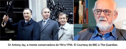 Sir Antony Jay é a asa direita dos clássicos Yes Minister e Yes Prime Minister. Com Mr Jonathan Lynn cria nos 80s o inesquecível trio RH Jim Hacker, Sir Humphrey Appleby e RH Bernard Woolley, respetivamente protagonizados nas séries da BBC por Mr Paul Eddington, Mr Nigel Hawthorne e Mr Derek Fowlds. Magistrais na caraterização e nas justas verbais que ventilam Whitehall, a todos o Minister/PM, o Permanent Secretary e ainda o Private Secretary ensinam – a começar pelos profissionais do voto e afins ― como opera a máquina administrativa e se defende o interesse público. Exemplos? Recorde-se RH Jim Hacker no episódio Equal Opportunities [YM] a enunciar os princípios do funcionalismo: “First one. It takes longer to do things quickly; Second. It is more expensive to do things cheaply; Third. It is more democratic to do things in secret.” Ou pondere-se a ragione dello stato presente na estratégia do Foreign Office para resposta a qualquer crise internacional, conforme definida em A Victory for Democracy [YPM]: “(1) Say that nothing is going to happen; (2) Say something maybe going to happen, but we should do nothing about it; (3) Say maybe we should do something about it, but there is nothing we can do; (4) Say maybe there was something we could have done, but it is too late now.” Sir Antony Jay deixa vivo legado. E os maiores e menores Hackers & Applebys em volta demonstram-no.
