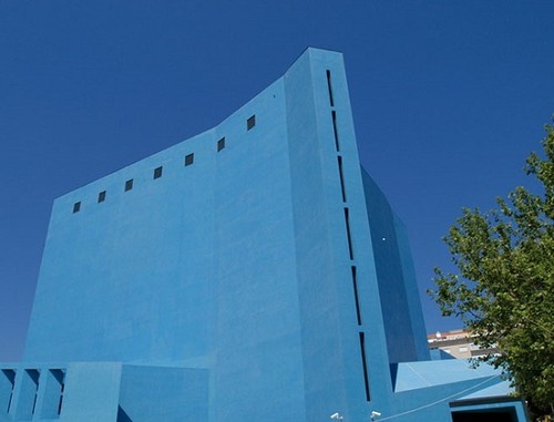Também como já escrevi, o nome de Teatro Azul deriva do revestimento em mosaico cerâmico vitrificado de cor obviamente azul, que deu leveza a um edifício complexo, encravado numa rua estreita. E essa topografia desnivelada, digamos assim, enquadra uma empena curva, vasta e cega até à cobertura: uma espécie de triângulo abaulado, passe a expressão talvez pouco rigorosa aplicada a um notável edifício, mas que se prolonga até à cobertura.