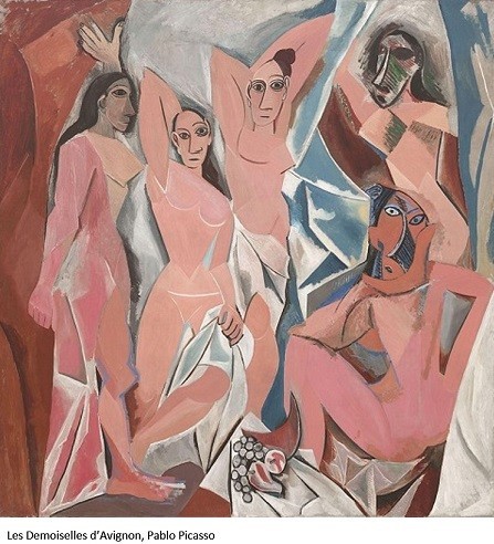 2. Demoiselles D`Avignon (As Meninas de Avignon), de Pablo Picasso, é a obra chave de arranque do cubismo. Além da pouca profundidade espacial e da natureza bidimensional do quadro, os cinco corpos femininos nus são reduzidos a grupos de triângulos e losangos, as cabeças das duas mulheres à direita foram substituídas por máscaras africanas, a da esquerda lembra uma estátua egípcia antiga, as duas centrais são tidas como caricaturas estilizadas, parecendo cortadas por um corta-papel de um papel cor de terracota. Após este início, estabelece-se uma espécie de duo entre Braque e Picasso, fundadores do cubismo, atingindo ambos uma arte verdadeiramente cubista, entrando no cubismo analítico de que As Meninas foram suas percursoras.