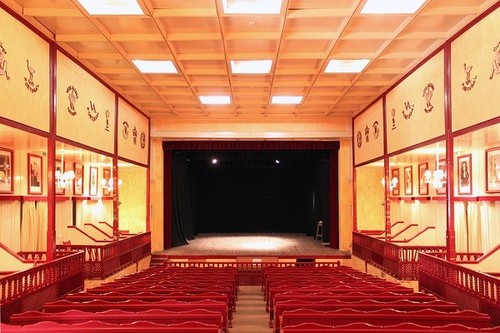 «O primeiro teatro foi demolido e o que se construiu em 1851 tinha o pano-de-boca e o teto pintados por Rousseau. Quando foi aumentado, foram substituídas essas pinturas, que infelizmente desapareceram. O atual pano foi pintado por João Cazeaux, desenhador na Fábrica (…). No teatro representam empregados e operários da fábrica, que têm levado à cena muitas comédias e operetas. “Os Milagres de Santo António” é uma das peças que mais sucesso tem tido. Já se representou o “D. César de Bazan”. Alguns operários e operárias recitam poesias e monólogos»…