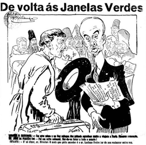 José de Figueiredo aparece aqui caricaturado por Francisco Valença. O tema é o dos famigerados Painéis ditos de S. Vicente de Fora. O diálogo é entre o Infante D. Henrique e o diretor do Museu das Janelas Verdes. O tema é o grande sucesso de viagem dos painéis, então dois trípticos, até Paris em 1931. Foi um tremendo sucesso – e Figueiredo propõe-se levar os Painéis a todo o mundo… É o que confidencia a Henrique. O Infante, que bem conhecia Paris por estar lá na Crónica dos Feitos da Guiné com a sua imagem, que poderá ter permitido a identificação da obra atribuída a Nuno Gonçalves, responde ao diretor atónito: “É só dizer, o mais que pode acontecer é o Sr. Luciano Freire ter de nos restaurar outra vez”! A história teria, no entanto, mil andanças. Muito se discutiria e discute sobre esse misterioso quadro. A graça desta caricatura do “Sempre Fixe” está em que nessa altura as obras-primas viajavam. Isso tornou-se agora impensável, e o Infante D. Henrique põe água na fervura dizendo, afinal, que o entusiasmo de José de Figueiredo era algo prematuro… Foi, porém, a ida a Paris que tornou o políptico célebre e celebrado. A discussão será sempre interminável e as conclusões sempre precárias. Uma certeza fica: em San Miniato al Monte em Florença, no altar do túmulo de D. Jaime, o Cardeal de Portugal, S. Vicente está representado com grande semelhança aos painéis de S. Vicente de Fora…
