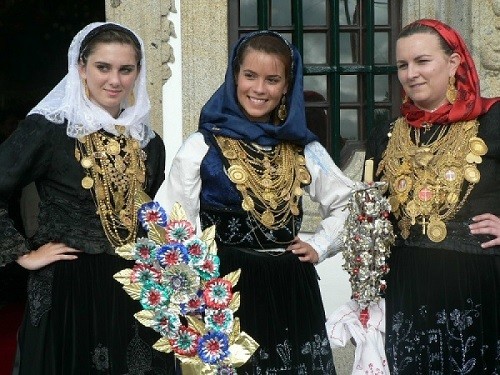 As Festas da Senhora da Agonia constituem um exemplo de património cultural imaterial que corresponde ao encontro de diversas influências tradicionais e históricas. Se o acontecimento que hoje presenciamos vem do século XVIII, a verdade é que resulta da convergência de ritos pagãos cristianizados muito antigos. O fundo céltico junta-se às tradições dos suevos, visigodos e galegos . As mordomas, as lavradeiras, as morgadas ou as noivas apresentam indumentárias cuja origem se perde na noite dos tempos. As cores, sobretudo das lavradeiras, são variadas: vermelho, verde, amarelo, azul ou mesmo preto. Trazem na mão palmito ou vela votiva, têm lenço na cabeça e muito ouro ao peito, devendo ser solteiras e sem fama. As mordomas, que se encarregam de reunir fundos para a festa e irmandades, trazem avental, muitas vezes com as armas reais, os mais antigos. Se nos lembrarmos dos testemunhos vivos, percebemos que uma mordoma pode trazer na cabeça um lenço com "mais de cem anos" que terá pertencido a uma trisavó, nas orelhas ostenta uns brincos de ouro da mesma época, ao peito dois grilhões, uma moeda e vários fios em ouro "verdadeiro"… O traje de noiva é negro e soberbo, de uma grande riqueza, troca o lenço de mordoma (colorido e de seda), por um lenço de fina cambraia (em algodão ou linho) bordado, cruzado à frente. O véu de renda ou tule bordado é levado de pontas caídas sobre o peito. A vela votiva e a palma da Páscoa são trocadas pelo ramo de noiva, normalmente de formato redondo e composto de vivaz e flores de laranjeira. O lenço de namorados é decorado com motivos florais, frases de amor e motivos ornamentais, sempre feitos em ponto cruz, ponto cheio e de pé-de-flor.