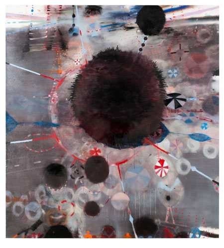 O desenho, por isso, nas pinturas é introduzido no meio de uma vastidão. Injecta nova informação, detalhe e camadas de espaço. Permite a transferência para a tela, do fluxo intuitivo da consciência. E traz a sugestão de bandeiras, hélices, bombas, traços de fogo, meteoritos, bactérias e células – elementos esses que agem como dispositivos formais, motivos que ficam na superfície do espaço, ambíguos e percussivos.