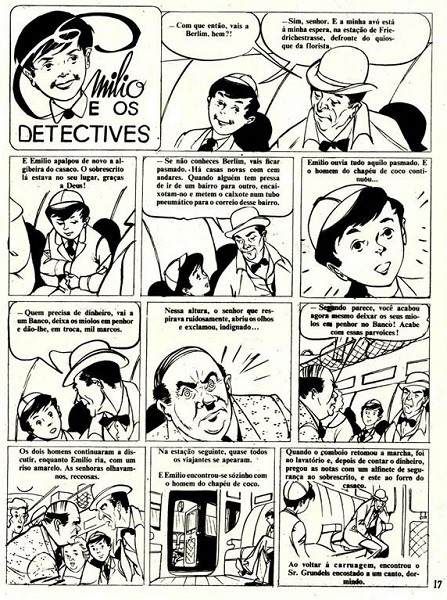 “O Cavaleiro Andante” publicou em 1957 e 1958, da autoria de Fernando Bento, a série “Emílio e os Detectives”, com base no célebre livro homónimo de Emil Erich Kästner (Dresden, 1899 – Munique , 1974). Hoje, é extraordinário, ver neste exemplo como a escola do “Cavaleiro Andante” foi um exemplo vivo de pedagogia da liberdade. Kästner foi escritor, jornalista e poeta que desenvolveu a sua atividade durante a República de Weimar. Com o início do regime nazi, foi um dos poucos intelectuais proeminentes contrários à situação que permaneceram na Alemanha, mas as suas obras fizeram parte da lista de livros queimados na noite de cristal e considerados como antinacionais. Apesar de várias represálias, pôde trabalhar sob um pseudônimo como jornalista e autor de diversos filmes de comédia. Com o fim da Guerra, em 1945, Kästner regressou à escrita com o seu próprio nome, tendo sido eleito em 1951 presidente do PEN Clube da RFA. Tomando posição contra o rearmamento, solidarizou-se com os movimentos pacifistas e militou na causa antinuclear. Foi assim um homem de cultura devotado às causas da liberdade e dos direitos humanos. A sua popularidade deveu-se principalmente aos seus livros infantojuvenis, como “Emílio e os Detectives” (1929), “A Sala de Aula Voadora (1933) e “Cachos e Tranças” (1949), além de um vasto conjunto de poemas, epigramas e aforismos. Uma de suas mais conhecidas coletâneas de poesia, foi publicada pela primeira vez em 1936 pela editora suíça Atrium sob o título de “A Pequena Farmácia do Dr. Erich Kästner”. Em 15 de outubro de 1929, foi lançado o livro “Emílio e os Detectives”, por sugestão de Emil Jacobsohn. O livro constituiu um enorme sucesso, teve mais de dois milhões de cópias vendidas só na Alemanha e até hoje já foi traduzido para cinquenta e nove idiomas. O romance decorre na cosmopolita cidade de Berlim de entre guerras, constituindo um verdadeiro roteiro e uma homenagem aos berlinenses, aos seus monumentos e estrutura urbana e sobretudo aos cidadãos. O espírito de aventura e a alegria dos seus protagonistas contrasta com o clima depressivo e bélico que se desenvolvia e que teve os efeitos dramáticos conhecidos. Não podemos ainda esquecer a qualidade das ilustrações de Walter Trier, que foi um ingrediente extraordinário para tornar este livro como referencial, não só na Alemanha, mas na Europa. A versão cinematográfica de “Emílio e os Detectives”, dirigida por Gerard Lamprecht com Billy Wilder, foi um grande sucesso de 1931. No entanto Kästner considerou que o filme não era fiel ao espírito do livro… De qualquer modo, pode dizer-se, ao menos duas coisas, é verdade que a versão cinematográfica não dispensa a leitura do livro, para a compreensão do seu verdadeiro espírito, há, de facto, aspetos que divergem do espírito do autor; mas, por outro lado, o filme foi grandemente responsável para multiplicar o sucesso do livro, atraindo muitos leitores, que assim descobriram o caráter único e inovador do romance e do seu fantástico espírito. E é neste ponto que merece referência especial a versão de Banda Desenhada de Fernando Bento realizada para o “Cavaleiro Andante”. Com “Beau Geste”, estamos perante uma das obras-primas daquele que foi certamente, ao lado de Eduardo Teixeira Coelho, um dos maiores artistas portugueses da Histórias de Quadradinhos. Seguindo de perto o romance de Kästner, procurando ser-lhe fiel, apresenta um traço inconfundível e uma narrativa muito viva e original, que não só atrai para a leitura da obra que lhe serve de base, como demonstra, com clareza, a importância do espírito de liberdade e aventura que contempla, em contraste com a lógica belicista e não-democrática. Dir-se-á, pois, que “Emílio e os Detectives” prenuncia o melhor espírito do que viria a ser a Alemanha federal – e hoje constitui uma homenagem à cidade de Berim, que se tornou símbolo da cultura de liberdade europeia!