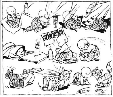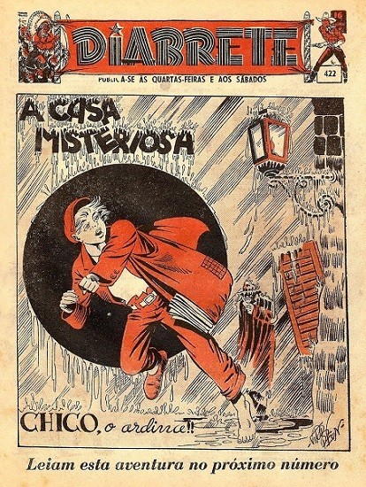 Há oito dias, lembrei uma capa de “O Mosquito”, hoje trago-vos uma velha capa do “Diabrete”, título marcado pela direção de Adolfo Simões Müller (1909-1989), revista nascida em janeiro de 1941. Como sabemos, foi “O Papagaio”, no tempo de Simões Müller, que publicou pela primeira vez em Portugal as aventuras de Tintin. Saído da Renascença, o professor e jornalista tentaria levar consigo as aventuras do repórter belga, o que apenas conseguiu depois de muita persistência para convencer Hergé. Não se esqueça que foi por intermédio do Padre Abel Varzim (1902-1964) que foi conseguida pelo Monsenhor Lopes da Cruz (1899-1969) a tradução pioneira para português das aventuras de Tintin, na altura designado como Tim-tim. Portugal não só foi o primeiro país não francófono a publicar a tradução dessa obra, que se tornaria essencial na história da Banda Desenhada e das modernas Artes Plásticas (colocando Hergé a par de Andy Wharol e Roy Lichtenstein), mas também porque foi onde pela primeira vez se introduziu cor nessa narrativa ilustrada. O “Diabrete” durou até à última semana de 1951 e deu lugar ao “Cavaleiro Andante”. E podemos dizer que Fernando Bento (1910-1996), também gráfico do “Cavaleiro Andante”, foi essencial no caminho seguido pelo “Diabrete”, que se traduziu num claro aperfeiçoamento das histórias de quadradinhos em Portugal, que ganharam uma dimensão que pode comparar-se à melhor evolução extra muros. Com o tempo, a imprensa juvenil foi ganhando maior importância na ilustração e na ligação entre a narrativa e o desenho. Lembremo-nos de que “O Papagaio”, revista fundada em 1935, começou por ter pouca ilustração, apesar da qualidade se ter afirmado desde muito cedo, designadamente com um dos grandes artistas portugueses do século, Júlio Resende (criador de Matulão e Matulinho)… É muito significativo que em Portugal se tenha desenvolvido o género, em ligação estreita com o modernismo e os caricaturistas, desde Almada Negreiros, Stuart, Cottinelli Telmo, Carlos Botelho ou Emmérico Nunes… É essa a genealogia que deve ser lembrada e que chega ao nosso melhor século XIX com Rafael Bordalo Pinheiro. Desde Zé Povinho e Maria Paciência, a Quim e Manecas, indo aos apontamentos de Fernando Bento com Filipim – podemos dizer que há em Portugal uma evidente repercussão da melhor criatividade europeia…