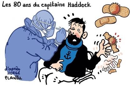 Também hoje assinalamos os oitenta anos do encontro do Capitão Haddock com Tintin, em 9 de janeiro de 1941, no “Le Crabe aux Pinces d’Or” (O Caranguejo das Tenazes de Ouro). Para o efeito reproduzimos o desenho de Plantu, publicado na primeira página do circunspecto “Le Monde”. É caso para dizer “tonerre de Brest”, “Mille Miliards de Mille Sabords”, “Sacré de cercopithèque…”. Os tintinófilos estão todos de parabéns, uma vez que este companheiro de Tintin, que ele trouxe ao caminho da virtude e se tornou amigo inseparável é uma referência essencial. Plantu invoca a cena do esparadrapo em “Tintin au Tibet”, transformando-o na representação do terrível vírus Convid-19, de que nunca mais nos vemos livres.