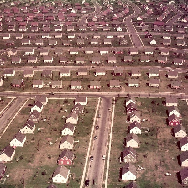 Mas, Mumford revela que a utopia do subúrbio antigo terminou através do movimento em massa que se deu em direção a essa dispersão e liberdade. Nesse movimento coletivo, visível a partir do séc. XX, produziu-se um novo tipo de desenho suburbano com deficiências evidentes: “…uma multidão de casas uniformes, inidentificáveis, alinhadas de maneira inflexível, a distâncias uniformes, em estradas uniformes, num deserto comunal desprovido de árvores, habitado por pessoas da mesma classe, mesma renda, mesmo grupo de idade, assistindo aos mesmos programas de televisão, comendo os mesmos alimentos pré-fabricados e sem gosto, guardados nas mesmas geladeiras, conformando-se, no aspeto externo como no interno, a uma modelo comum, manufaturado na metrópole central.” (Mumford 1998, 525)