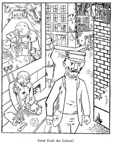 'Freut Euch des Lebens' (Alegrai-vos na vida) é o melhor retrato da Alemanha, entre guerras, sob o humilhante Tratado de Versalhes. O caos avassalador provocou na sociedade um desassossego e uma instabilidade interminável. A Alemanha era assim palco de imensos contrastes e Grosz através dos seus desenhos limpos e claros desejava capturar essas desigualdades grotescas.