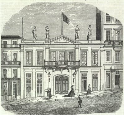 E nesse sentido, podemos aqui evocar a própria estrutura do Teatro Baquet. No exterior, a gravura mostra a fachada muito da época, no conjunto de estátuas evocativas da comédia, da pintura e das artes em geral, sobre a grande varanda do que seria o foyer, como então (por vezes ainda hoje...) se denominava a sala de acesso e convívio do público.