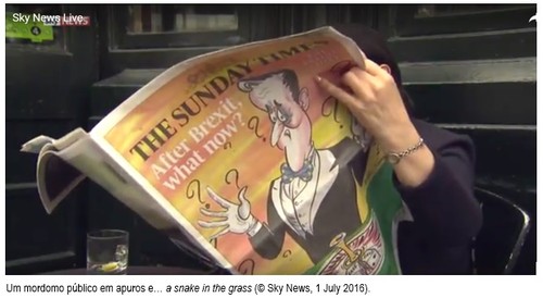 So, what about The Politics of The Day? Desde as datas do fim de Lady Thatcher em Downing que nada de símil se vira; então com um justérrimo adicional de homicida enclausurado nas sidelines ao invés da indecorosa alternativa de ocupar The First Chair. O vácuo do poder é sempre terrível. Daí, aliás, a treinada presteza com que cá se fazem mudanças no Number Ten. A coisa é tal, que a literatura logo é chamada à interpretação. As referências invocam cena de The Sopranos (in the Middle-earth, of course), Game of Thrones ou The Tragedy of Macbeth. RH Boris Johnson é assassinado pelo seu chefe de campanha, ao vivo, na televisão, a horas da candidatura a Prime Minister. O ato visa ser fatal para o Brexiter: adaga bem na testa, a fim de não mais colher votos na floresta. Tal qual como a Sir Cameron, que ao ávido ofertara o posto em Whitehall, ao par falham… “that executive authority, that strength of purpose, that clarity.” A Premier, antes outro: Ele! Para o demonstrar, lê a radical 5,000-word manifesto. “Treachery! Brexecution!,” ecoam as Houses of Parliament. O Tweetminster ensandece. “Gove’s betrayal of Boris must be one of the most treacherous in Tory history. More brutal than Geoffrey Howe & Margart Thatcher,” sintetiza Mr Sebatian Payne. Rádios e jornais pontificam: “Et Tu Brute!” A autópsia da intriga ocorre ontem, finalmente, em technicolor, na BBC. O Justice Secretary é etiquetado por Mr Andrew Marr como “a political serial killer,” com punch question saída do sinistro livro de Lord Dobbs: "House of Cards - you're our Frank Underwood, aren't you?"