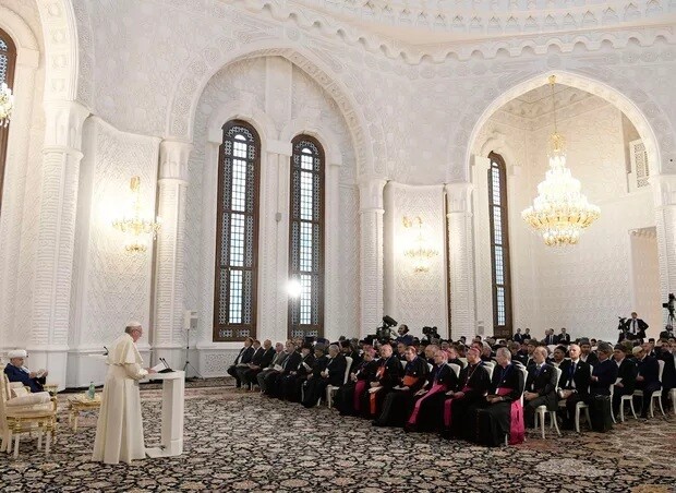 Papa Francisco em mesquita no Azerbaijão. Foto: L'Osservatore Romano/Pool Photo via AP