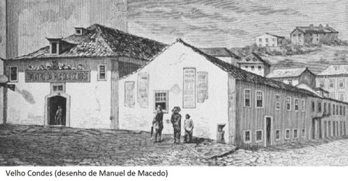 Trata-se aqui do chamado “Velho Condes” que vem do século XVIII e do qual resta uma gravura que mostra um barracão situado onde mais ou menos se irá erguer, com a nova Avenida da Liberdade, os sucessivos “Novo Condes” e o Cinema Condes!...