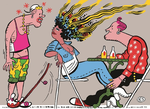E nisto Jaime nauseado, não era a primeira vez que lhe dava, em situações de pânico, uns ameaços de vómitos que nunca se decidiam, ficavam ali a atormentá-lo, a embrulhar-lhe o estômago, curioso, pensava, ele que dava piruetas, fazia rodopios, saltava à altura de parapeitos sem vertigens, uma vez até de um terceiro andar, caramba, era um skater reputado lá no bairro, o seu próprio corpo devia mostrar alguma consideração por ele mesmo, e esta sensação que não o abandonava, o andar de embarcadiço, o olhar de marinheiro ausente, já afastar-se do Bar do Bill, enjoado com o cheiro a charro, alheado das interpelações pouco lúcidas do Nelson abraçado à morta ou à gémea da morta, ia dar no mesmo, que coisa, ele até tinha um olhar felino, calculava com precisão as distâncias, raramente se estampava e se acontecia, era defeito do material, um deck bambo, o parafuso do truck que se soltava, as rodas já sem aderência, os amortecedores manhosos, que o Rastapoupolos até nem era mau tipo, mas toda a gente sabia que na oficina dele as peças não vinham em primeira mão, e por isso custavam um terço do preço, mais trabalho lhe dava embalá-las no invólucro certificado a dizer «à prova de contrafação» do que faná-las aos betos das avenidas, coitado, não era mau tipo, a intrujice estava-lhe no sangue, ninguém do bairro levaria a mal se ele confessasse que tiveram muitas andanças e outros donos aqueles skates desmontados, grande maluco o Rastapopulos, devia ser o único brother que Jaime conhecia que tentava adaptar a sua imagem à alcunha que um dia um setôr lhe colocou, vinha de uma banda desenhada qualquer, parece, coisas de cotas, mas a malta achou graça, era exótico e ficou assim, e lá teve o bacano de deixar crescer rastas até às omoplatas, apesar de ter cabelo fino, quase louro, e duas entradas que ameaçavam alopécia precoce, diabos, o enjoo não o largava, também dar de caras com uma morta, e ver a sua réplica minutos depois, sabia lá se tinha ou não sinal na coxa, ainda por cima vinham-lhe à cabeça umas tatuagens demasiado familiares, já tinham passado por baixo dos seus olhos, ou dos seus dedos, numa destas noites de nebulosa, um dragão enrolado a soprar labaredas, funesta coincidência, e isso ainda lhe dava mais tonturas, precisava de acalmar, recuperar forças para enfrentar a fúria da mamã Rosa, por causa da maldita chave, e ainda a da bófia, por causa de um crime que não cometeu, pensando bem, antes a bófia do que a mamã Rosa, não lhe daria tréguas, ela bem o avisou que devia usar uma corrente nas presilhas das calças para não perder a chave nos seus saltos mirabolantes, mas onde se viu um skater de corrente, ia ser a chacota do bairro, pensando bem, antes a fúria da Mamã Rosa, no elenco das iras que tentava hierarquizar, do que ser gozado pelos manos, pá, que um homem não é de ferro, até no pé sentia uma dor, era capaz de ser uma dor reflexa e só agora a sentia, o melhor era beber mais um pouco de água e foi ao passar pelo chafariz que deu por ela, a chave, a rebrilhar, entre as golfadas intermitentes, passou os dedos pelas reentrâncias, não havia dúvidas de que era a sua chave, estava safo, da polícia, da Mamã Rosa, da morta e da sua gémea e nisto passa-lhe a náusea tal como chegara, só aquela dor no pé, que ele, de tão feliz, fazia por ignorar, agora, prometia-se, iria portar-se bem, manter-se à sombra durante uns tempos, bastou para o susto, e nem é tarde nem é cedo, rumaria de seguida à oficina do Rastapopoulos que, além de outras coisas, também fazia duplicados de chaves, era muito dotado o rapaz, estranha esta sensação agora de estar a ser observado, bem o sabia, a sua fama no bairro não o deixava passar incógnito, mas geralmente recebia olhares de apreço ou de medo, não este tipo de olhar de soslaio e que ele não sabia descodificar, bem, havia de averiguar mais tarde, tinha de gozar bem a sensação de alívio, respirar fundo, começava a ouvir uns rumores, grupos de pessoas que comentavam o incêndio, que foi logo extinto pelos bombeiros, antes assim, que se não fossem os soldados da paz a arrombarem a porta nunca dariam pela morena, que se safou por pouco da overdose, diz quem viu que até sangrava pelo nariz, enquanto a transportavam na maca, excelente, meu, não havia morte, não havia homicídio, e se não fosse ele a atear o incêndio a tipa não se salvava, top, queria lá saber da gémea, do sinal na coxa, desde os chuis não suspeitassem, tá-se bem, algo lhe dizia que ainda seriam muito felizes os três, quem sabe, Jaime gostava e sonhar e saltar alto, mexericos, sirenes da polícia, só não percebia bem porque o olhavam, na rua, tão insistentemente, daí a nada haveriam de conhecer a fúria de um Jaime irritado, não era bonito de se ver, ai não era, não, e já ia chegando à oficina do Rastas, sempre cheia de clientela, novos rumores, novas conversas, tinham descoberto uns ténis meio derretidos no pátio da morena, número 43, a polícia procurava um skater incendiário e descalço, Jaime conectou os neurónios à dor no pé, era um facto, tinha andado este tempo descalço, toda a gente cochichava à sua passagem, e além disso, sangrava de um dedo mindinho.
